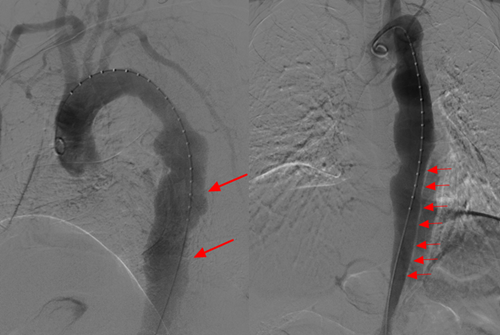 术中主动脉造影提示:胸降主动脉夹层动脉瘤形成,管壁凹凸不平,破口位于降主动脉,可见明显内膜分割影,将主动脉分为真腔、假腔。
